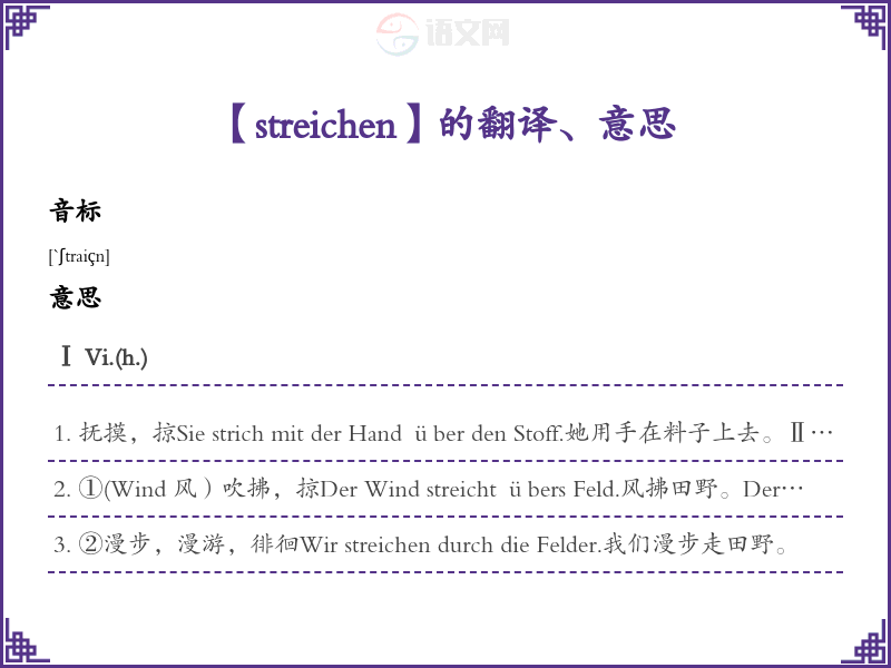 ④绵延,绵亘,延伸Das Gebirge streicht von Osten nach Westen.山脉从东往西绵延。Ⅲ Vt. (h.)