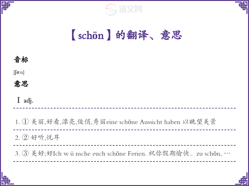 ③ 美好;好Ich wünsche euch schöne Ferien. 祝你假期愉快。zu schön, um wahr zu sein 好令人不能相信