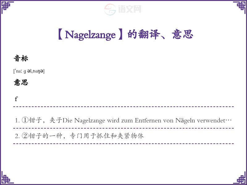 ①钳子,夹子Die Nagelzange wird zum Entfernen von Nägeln verwendet.钳子用于拔掉钉子。