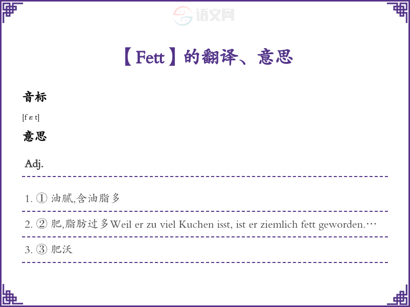 ② 肥,脂肪过多Weil er zu viel Kuchen isst, ist er ziemlich fett geworden.他因吃太多糕点,已经变得相。