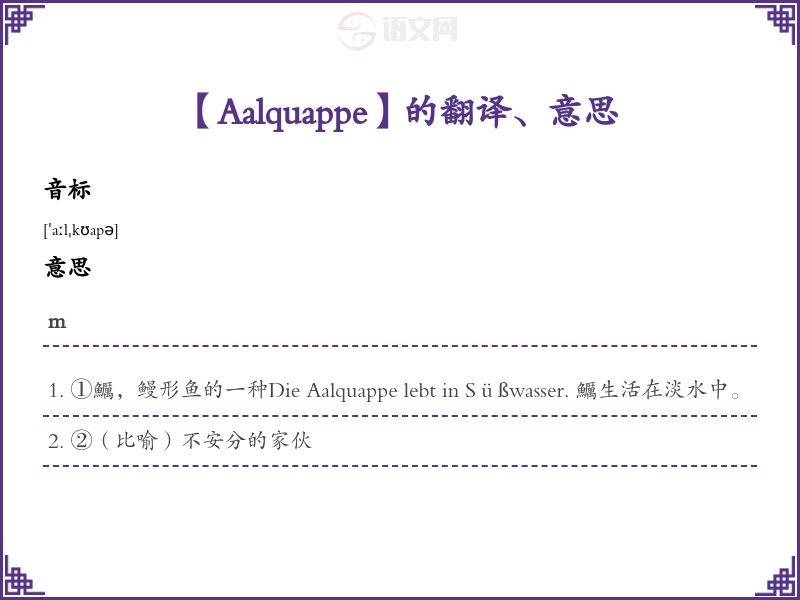 ①鱱,鳗形鱼的一种Die Aalquappe lebt in Süßwasser. 鱱生活在淡水中。