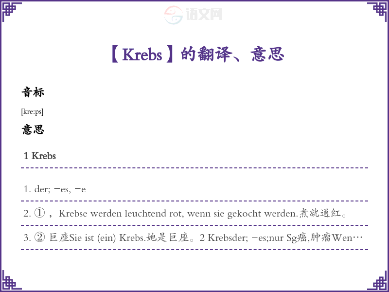 ② 巨座Sie ist (ein) Krebs.她是巨座。2 Krebsder; -es;nur Sg癌,肿瘤Wenn Krebs sehr früh erkannt wird, kann er oft noch geheilt werden.如果癌症能及,他往往还能治疗。