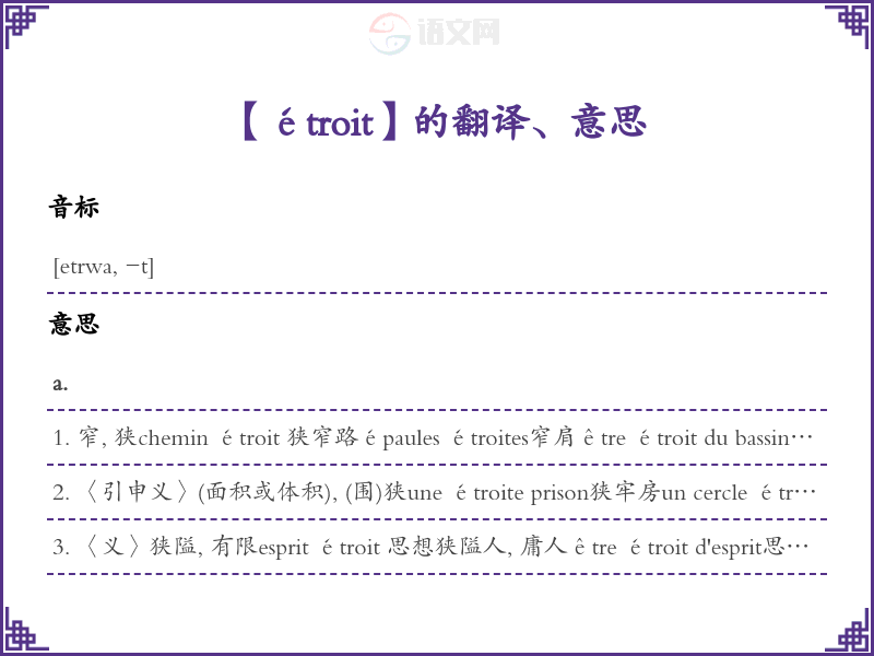2. 〈引申义〉(面积或体积), (围)狭une étroite prison狭牢房un cercle étroit de relations〈转义〉狭交际圈子mot pris dans son sens étroit 〈转义〉作狭义解释词