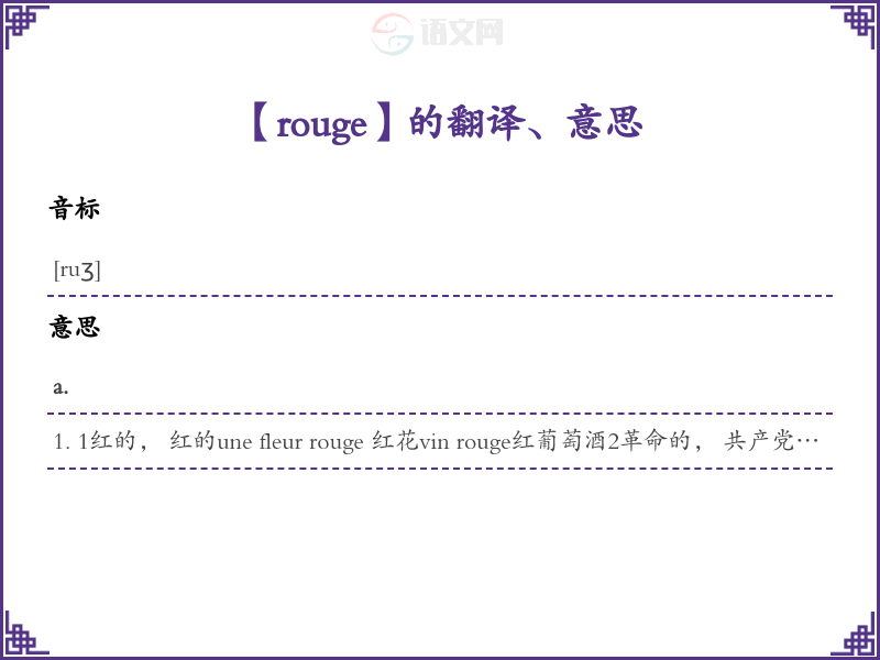 1. 1红的, 红的une fleur rouge 红花vin rouge红葡萄酒2革命的, 共产党领导的pouvoir rouge 红政权3烧红的, 热得发红的fer rouge 烧红的铁tison rouge 烧红的木柴4脸红的; 涨红的, 充血的être rouge de colère因生气而脸红être rouge de honte因羞愧而脸红5红棕的[指毛发]n. m1红, 红rouge vif 鲜红2红颜料, 红染料mettre du rouge en palette 在上放红颜料3红颜的美容品; 胭脂rouge à lèvres 口红4烧红5(由于羞愧、发怒等而)变红的脸6(命令停止前进或表示危险的)红灯; 红部分7 pl. 对革命或共产党人的种称呼8<口>红葡萄酒; 杯红葡萄酒口>