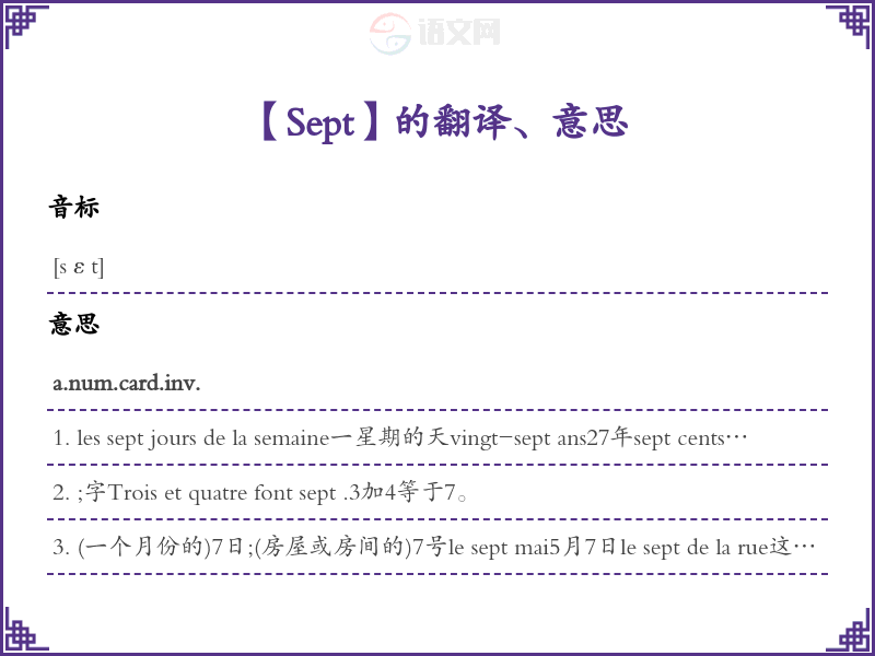 1. les sept jours de la semaine一星期的天vingt-sept ans27年sept cents hommes700人— a.num.ord.inv.第page sept 第7页Charles sept [VII]查理— n.m.inv.