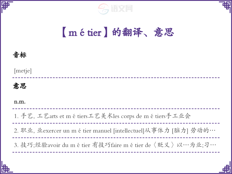 3. 技巧;经验avoir du métier 有技巧faire métier de〈贬义〉以…为业;习惯于…