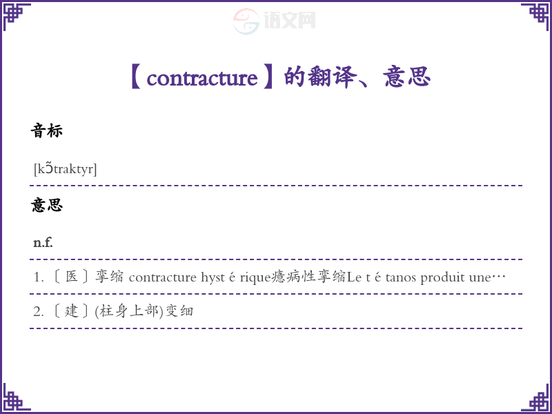 1. 〔医〕挛缩 contracture hystérique癔病性挛缩Le tétanos produit une contracture violente et douloureuse des muscles.破伤风会引起肌肉剧烈的而且非常苦的挛缩。