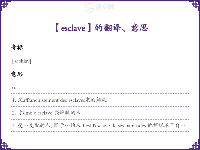 3. 受…支配的人, 囿于…的人Il est l'esclave de ses habitudes.他摆脱不了自己的习惯。les esclaves de l'argent金钱的隶— a.受役的, 受支配的, 盲目服从的être esclave de qn盲目服从某人, 是某人的隶être esclave de son devoir务缠身