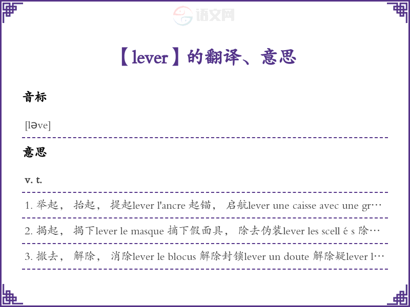1. 举起, 抬起, 提起lever l'ancre 起锚, 启航lever une caisse avec une grue 用吊车把箱子吊起lever le coude []拼命喝酒lever les épaules 耸肩lever les glaces d'une voiture 摇上汽车的玻璃窗lever la main pour prêter serment 举手宣誓lever les mains au ciel [转]哀求上帝ne pas lever le petit doigt 连手指也不动弹一下, 不肯出一点点力lever le pied []卷逃, 拔脚溜走lever la tête [转, ]无畏lever son verre 举杯, 祝酒lever les yeux sur qn 抬眼看某人