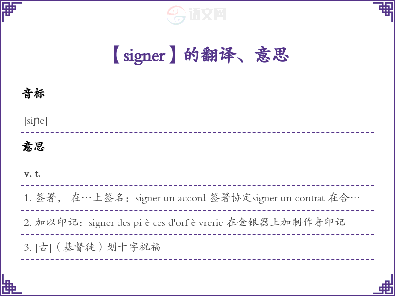 1. 签署, 在…上签名:signer un accord 签署协定signer un contrat 在合同上signer son nom [俗]签自己的名字signer la paix 签订和约; []和signer de son sang []自己的鲜血来签写:Je vous le signerais de mon sang. [俗]我可以头来向你担保。 C'est signé. []这就象署过名的一样。 [意即一看就知道是谁做的]
