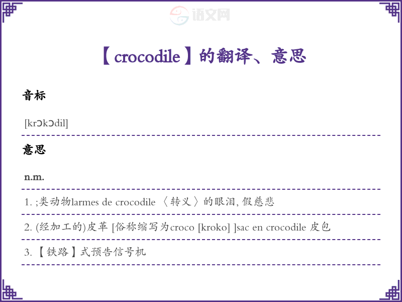 2. (经加工的)皮革 [俗称缩写为croco [kroko] ]sac en crocodile 皮包