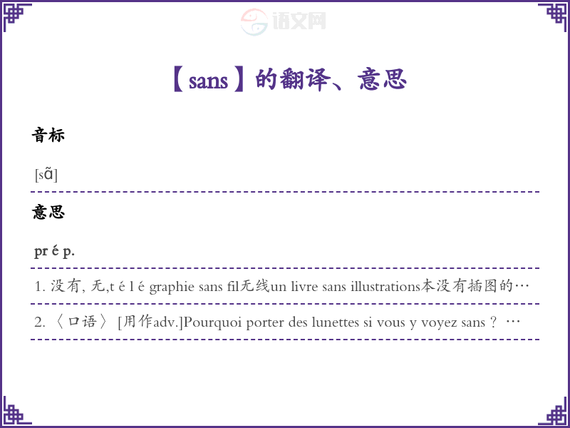 1. 没有, 无,télégraphie sans fil无线un livre sans illustrations本没有插图的书Il est parti sans sa serviette.他没有带公文包就走了。sans mentir老实说, 说假话être sans argent没有钱être sans le sou, être sans un〈口语〉个子儿也没有, 名文Votre café, avec ou sans sucre?您的咖啡, 加糖加糖?chambre d'hôtel à cinq cents francs par jour, sans le petit déjeuner每天500法的旅馆房间, 包括早饭Cela va sans dire.这还用说。当然如此。Vous n'êtes pas sans savoir que...您是知道…Ces choses-là, il faut y croire sans y croire.〈口语〉这种事情可可。Il travaille sans travailler.他马马虎虎地干活。