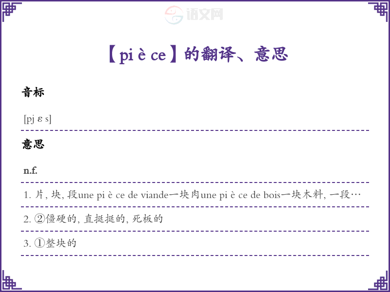 17. 【纹章】图记pièces honorables普通图记piècesloc.adv.全部地armé de toutes pièces全副武装的inventé [forgé] de toutes pièces彻头彻尾捏造的;纯属虚构的pièce à pièceloc.adv.一件一件地, 一块一块地, 逐渐地