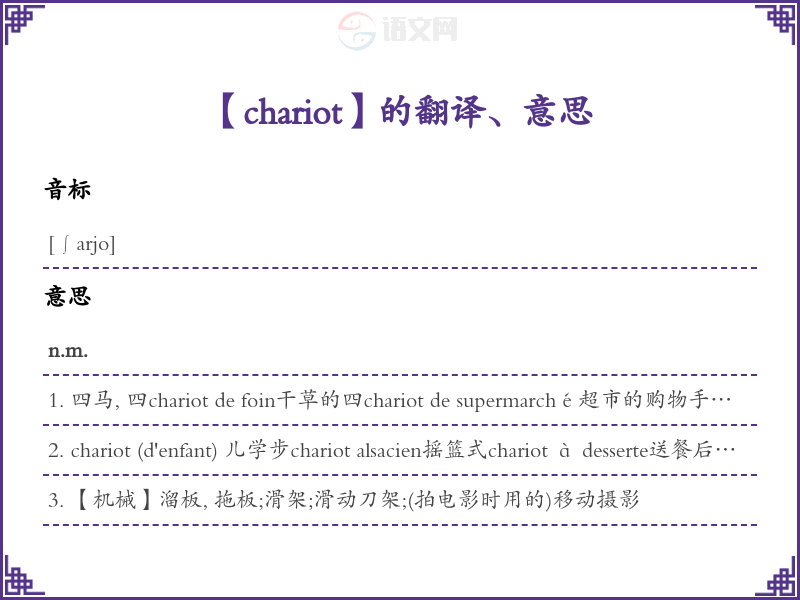 2. chariot (d'enfant) 儿学步chariot alsacien摇篮式chariot à desserte送餐后点心的台式小