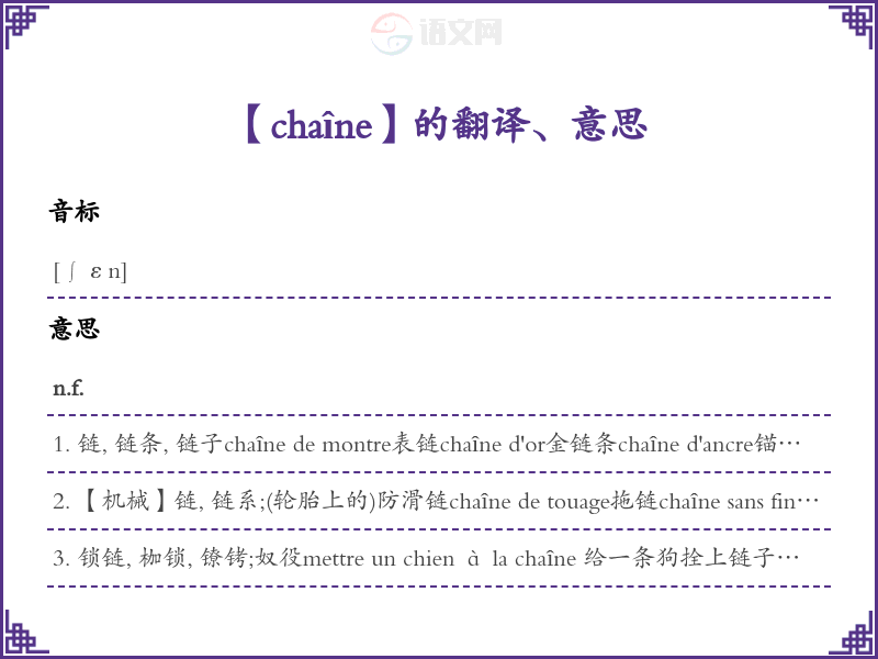 1. 链, 链条, 链子chaîne de montre表链chaîne d'or金链条chaîne d'ancre锚链chaîne de sûreté(扣在半开的门上的)安全链;钥匙链, 挂表链chaîne d'arpenteur测链 [丈量土, 10米]