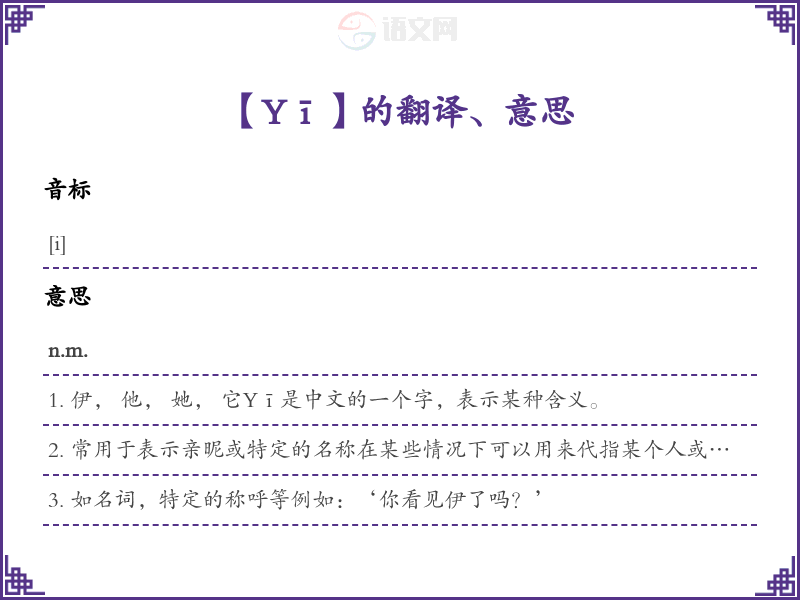 1. 伊, 他, 她, 它Yī是中文的一个字,表示某种含义。