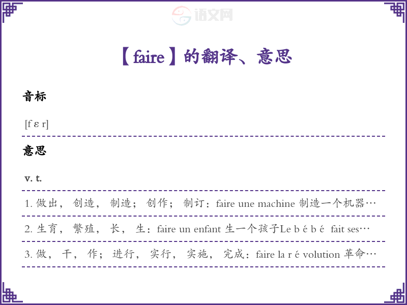 1. 做出, 创造, 制造; 创作; 制订:faire une machine 制造一个机器faire le pain 做面包L'abeille fait du miel. 蜜蜂酿蜜。 L'oiseau fait son nid. 鸟筑巢。 faire une loi 制订一项法律faire une société sans exploitation de l'homme par l'homme 建立一个有人剥削的社会