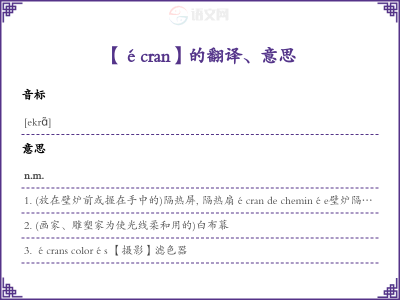 7. 〈引申义〉屏障, 幕écran de fumée烟幕société-écran 风公司 [指替另一个公司出面]écran solaire防晒油, 防晒霜La haie fait écran entre les jardins.花园与花园之间由篱笆隔开。