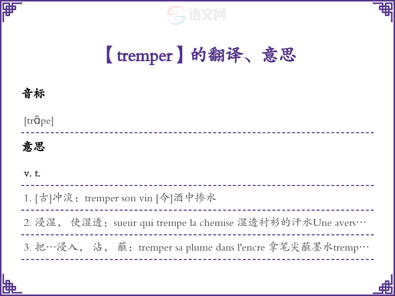 3. 把…浸入, 沾, 蘸:tremper sa plume dans l'encre 拿笔尖蘸墨水tremper ses lèvres dans une boisson 用嘴唇抿一下饮料se tremper la tête dans l'eau 把头浸入水中tremper la soupe 将肉汤倒面包上tremper ses mains dans le sang [转]双手沾血[指杀人, 指使或同意别人杀人]