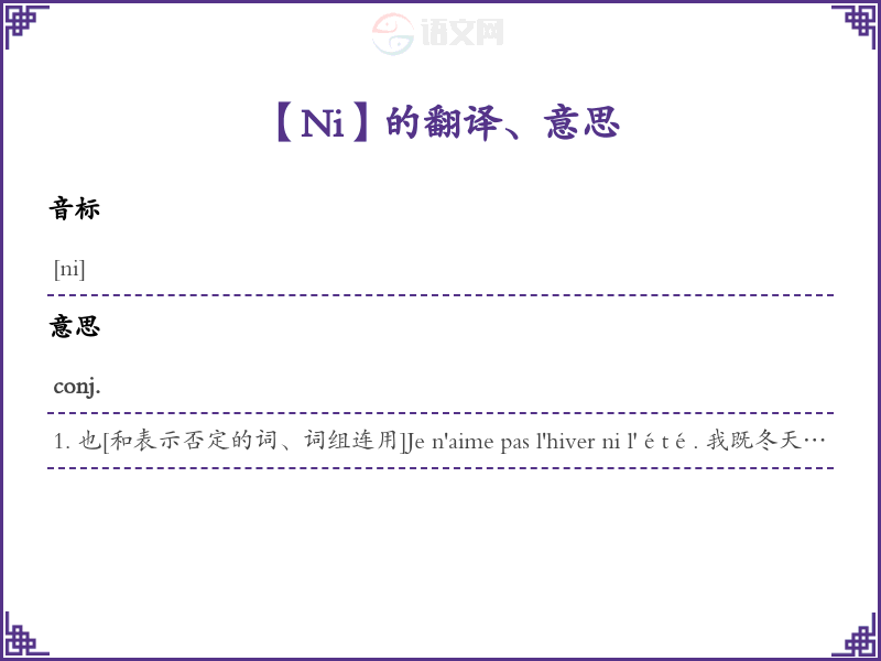 1. 也[和表示否定的词、词组连用]Je n'aime pas l'hiver ni l'été. 我既冬天也夏天。