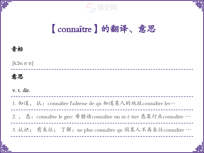 1. 知道, 认:connaître l'adresse de qn 知道某人的地址connaître les aspirations du peuple 了解人民的愿望faire connaître son sentiment 表达自己的感情, 表达自己的想法Je connais ce chemin. 认这条路。 Si l'on veut connaître la théorie et les méthodes de la révolution, il faut prendre part la révolution. 你要知道革命的理论和方法, 你就参加革命。