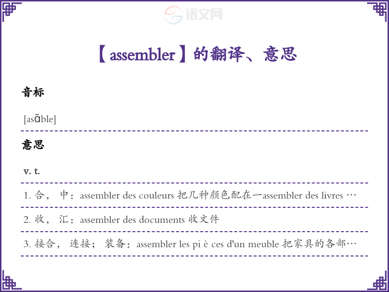 5. , 召开; 召…开会:Notre amitié militante nous assemble. 我们的战斗友谊把我们连接在一。 assembler le conseil 召开会议s'assembler v. pr.汇, , 会:Qui se ressemble s'assemble. [谚]物以类, 人以群分。 La foule s'assemble sur la place pour voir le feu d'artifice. 人群在广场上观看烟火