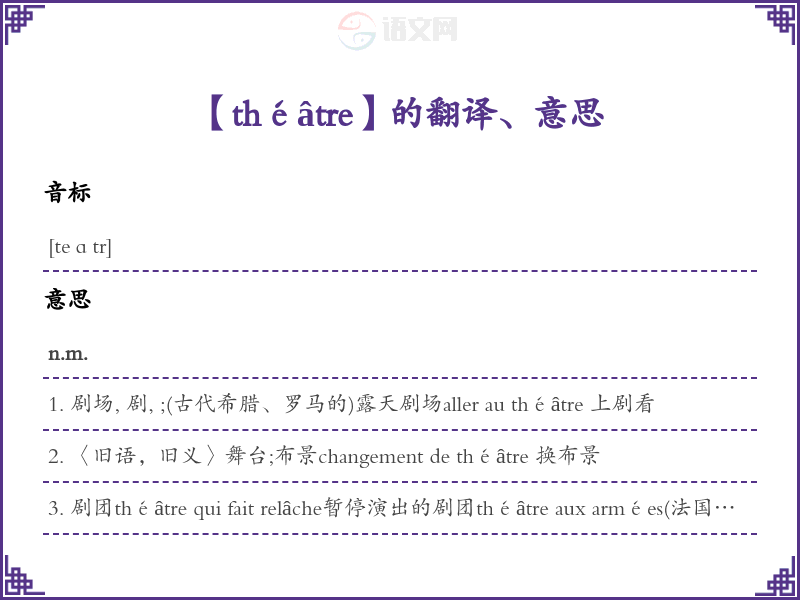 6. 剧le théâtre grec希腊剧critique de théâtre 剧评论théâtre filmé舞台录影片, 舞台艺术片pièce de théâtre 剧本, 剧作coup de théâtre 剧情的突变;〈转义〉剧性的变化