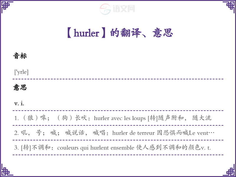 2. 吼, 号; 喊; 喊说话, 喊唱:hurler de terreur 因恐惧而喊Le vent hurle. 风在呼号。 La sirène hurle. 汽笛在尖。