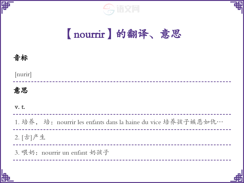 6. 助长; 维持; 增强:Le bois nourrit le feu. 木柴维持燃烧Le fourrage sec nourrissait l'incendie. 干草助长火灾火势nourrir les sons 声音浑厚洪亮nourrisson style 文笔有力