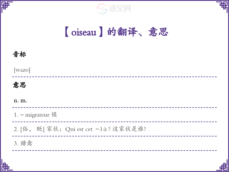 【oiseau】 助记: 词根: 联想: 名词变化: 近义词: 联想词