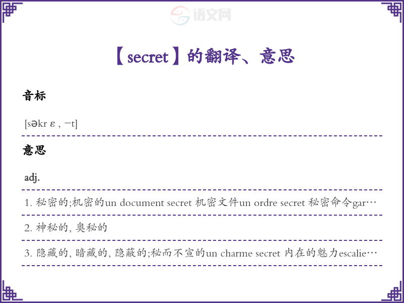 1. 秘密的;机密的un document secret 机密文件un ordre secret 秘密命令garder [tenir] une chose secrète 对件秘密codes secrets 密码négociations secrètes 秘密谈判fonds secrets(政府掌握而不必让议会知道其用途的)秘密经费(police) secrète 秘密警察services secrets 情报处agent secret 特工人员, 特务maladie secrète 性病vie secrète 私生活