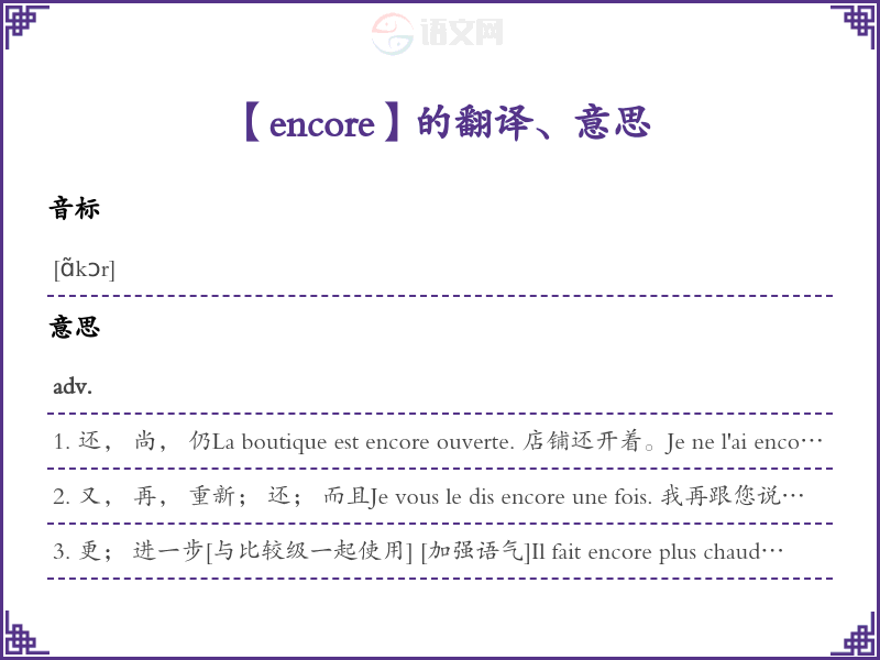 2. 又, 再, 重新; 还; 而且Je vous le dis encore une fois. 我再跟您说一遍。Prenez encore du poulet. 再吃些鸡肉吧。Non seulement il est bête, mais encore prétentieux. 不仅愚蠢,而且很傲慢。