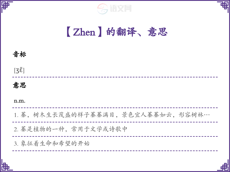 【Zhen】 助记: 词根: 联想 名词化: 词化: 形容词化: 近义词 反义词 同音、近音词 联想词