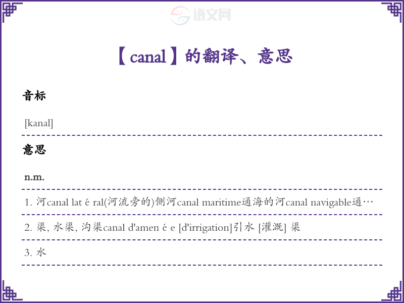 1. 河canal latéral(河流旁的)侧河canal maritime通海的河canal navigable通航河le canal de Suez [de Panama]苏伊士 [巴拿马] 河