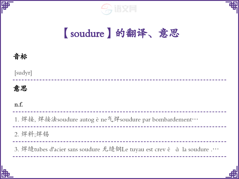 1. 焊接, 焊接法soudure autogène气焊soudure par bombardement électronique电束焊接soudure électrique à l'arc电弧焊soudure à l'hydrogène atomique氢原焊soudure par points点焊faire une soudure à l'étain用锡焊接faire la soudure 〈转义〉弥补青黄不接