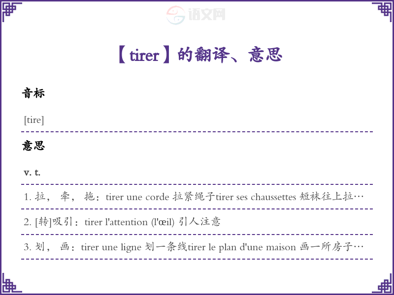 1. 拉, 牵, 拖:tirer une corde 拉紧绳子tirer ses chaussettes 短袜往上拉拉挺tirer les oreilles à qn 拉某人的耳朵se faire tirer l'oreille [转]让人再三请求, 不轻易同意tirer ses chausses (ses grègues) [转]逃跑tirer la sonnette d'alarme 拉响报警铃tirer le fils des marionnettes 拉木偶的线tirer les cordes (les ficelles) [转]暗中操纵, 幕后策划tirer qch en longueur 某事拖得很久tirer du métal en fils 金属拉成丝tirer qn par le bras 拉某人的胳膊tirer un tiroir 拉抽屉tirer un rideau 拉帘子[拉或拉上]tirer l'échelle 挪梯子[使不再靠墙]Après celui-là, il faut tirer l'échelle. [转]再没有比他更行的了。 tirer une porte dernière (après) soi手拉上tirer l'aiguille [引]做针线活儿tirer la couverture à soi 独占好处; 最大的一份占为已有tirer un texte à soi 一篇文章作有利于自己的解释cheval qui tire une voiture 拉车的马tirer la jambe (由于疲乏等原因)拖着腿走路