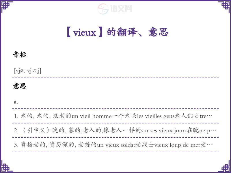 1. 老的, 老的, 衰老的un vieil homme一个老头les vieilles gens老人们être vieux 上纪, 老了vivre très vieux 长寿se faire vieux 上了纪, 老了vieux comme Mathusalem〈口语〉很老, 岁数很大 [玛士撒拉是《圣经》中传说的最长寿的人]se sentir très vieux 觉得自己已经老了vieux avant l'âge见老, 未老先衰être vieux de caractère性格上衰老了vieil imbécile老混蛋Ce vieux frère!位老兄!
