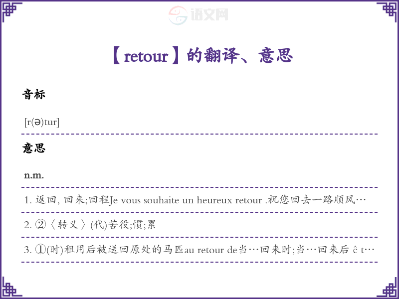 15. 报答, 回报payer qn de retour 报答某人, 回报某人retour de bâton不正当的利益sans retourloc.adv.不复返地, 永远地en retourloc.adv.作为报答, 作为交换Que lui donnerez-vous en retour ?您拿什么去报答他呢?