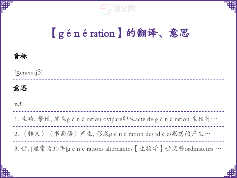 2. 〈转义〉〈书面语〉产生, 形成génération des idées思想的产生génération d'une surface【数学】曲面的形成génération d'un accord【音乐】和弦的根音