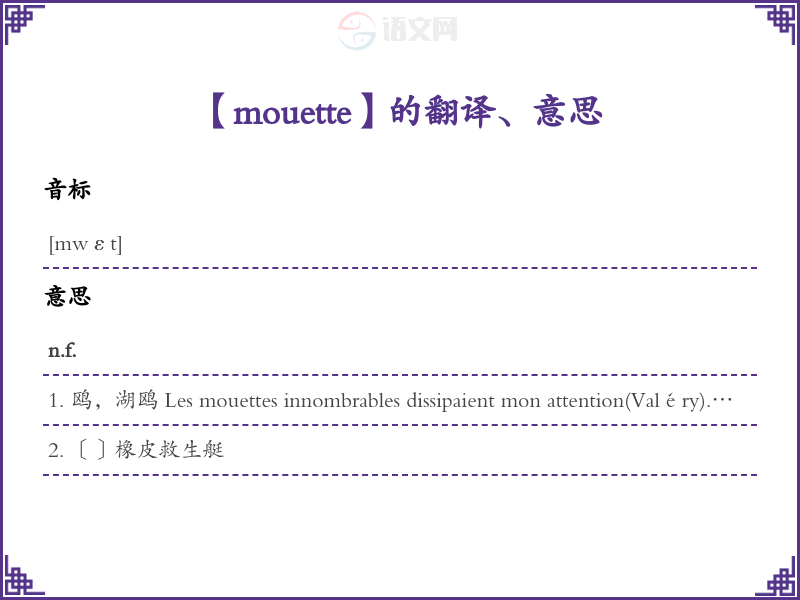 1. 鸥,湖鸥 Les mouettes innombrables dissipaient mon attention(Valéry).数不鸥分散了我注意力。(瓦勒里)