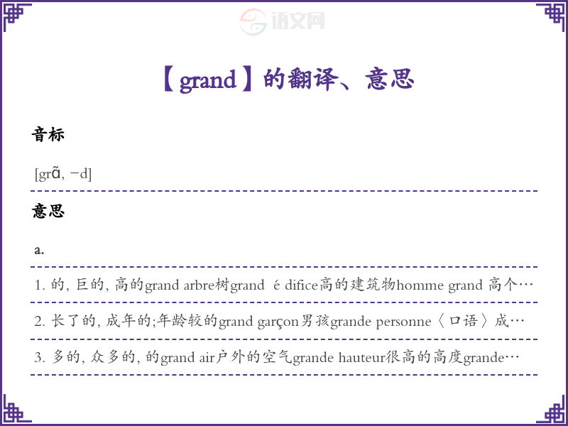 7. 伟的, 崇高的;高贵的;有名望的grand homme伟人grand personnage人物, 要人grands écrivains作家grand monde上流社会grande dame贵妇人grand poste [emploi]要职grand poète诗人de grand cœur〈转义〉由衷, 乐意, 自愿Alexandre le Grand, e 亚历山帝— adv.voir [faire] grand 有宏的计划;有很的设想— n.m.