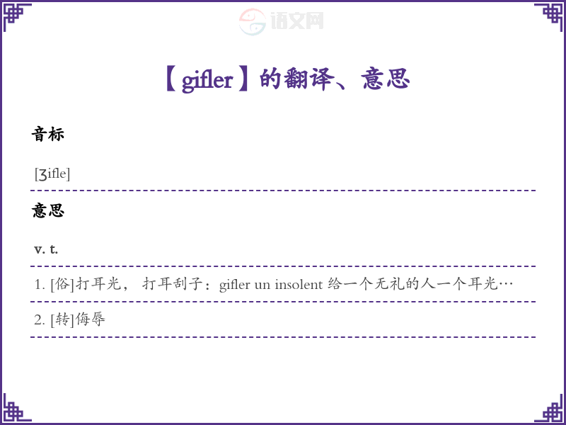 1. [俗]打耳光, 打耳刮子:gifler un insolent 给一个无礼的人一个耳光visage giflé par la pluie [引] 被雨打的脸