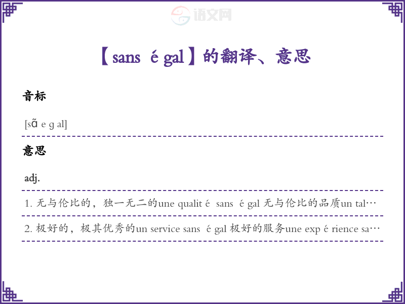 1. 无与伦比的,独一无二的une qualité sans égal 无与伦比的品质un talent sans égal 无与伦比的才华une beauté sans égal 无与伦比的美丽
