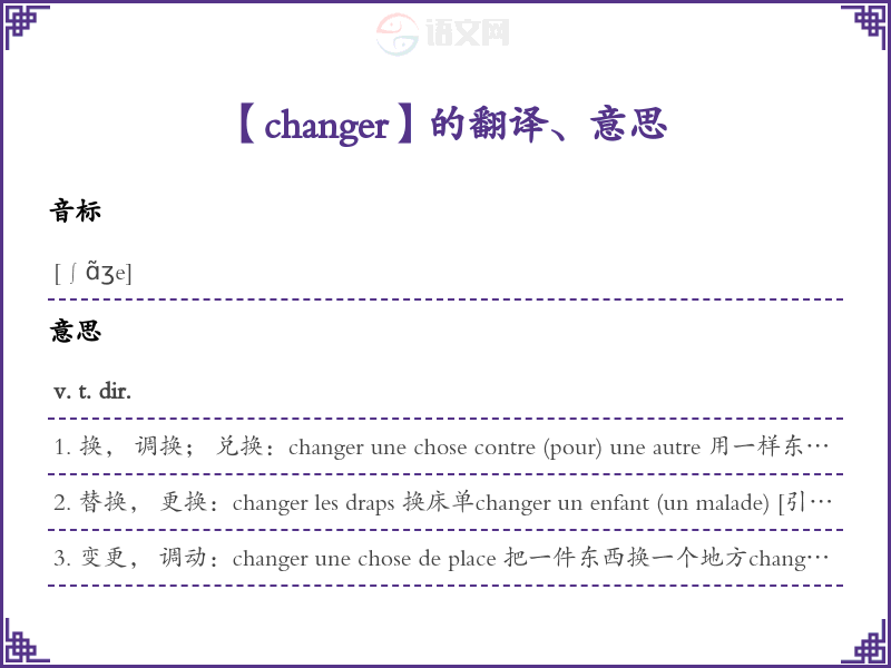 4. 变, 变动:changer ses plans 变计划Ce que j'ai dit, je n'y changerai rien. 我讲过的, 我决不口。 changer … en 把… 变…, 把…变为 …:changer un doute en certitude 使怀疑变为确信changer qch en bien (en mal) 使某事变好(变坏)Rien ne change ses convictions. [俗]没有什么能变他的信念。v. t. indir. (+ de)