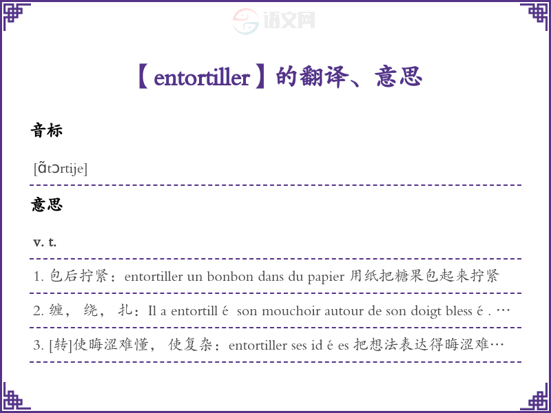 1. 包后拧紧:entortiller un bonbon dans du papier 用纸把糖果包起来拧紧