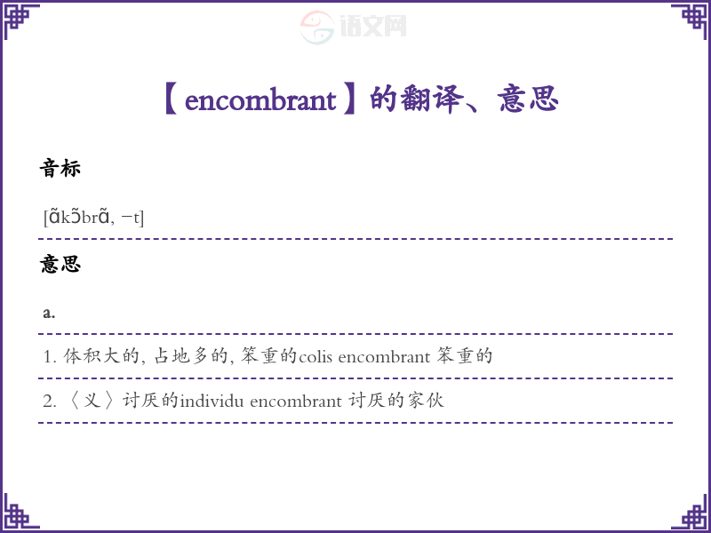 1. 体积大的, 占地多的, 笨重的colis encombrant 笨重的