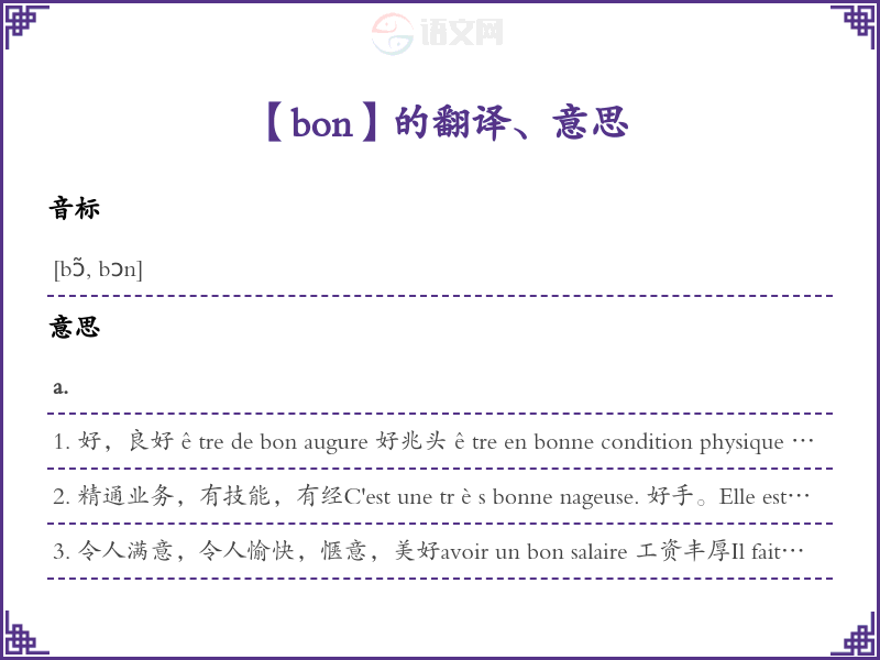 12. 放在句首,表示祝愿Bonnes vacances ! 假期愉快!Bonne continuation 再接再励Bon rétablissement ! 早日康复!Bon voyage ! 旅行愉快!adv.sentir bon 香, 有香味 tenir bon 坚持coûter bon 价格昂贵Il fait bon. 气候宜人。天气好。Il fait bon dans ta chambre. 你卧室很温馨。Il fait bon se promener. 散散步非常愉快。Il ne fait pas bon avoir affaire à cet homme. 同这人打交道真不愉快。同这人打交道真危险。n.m.