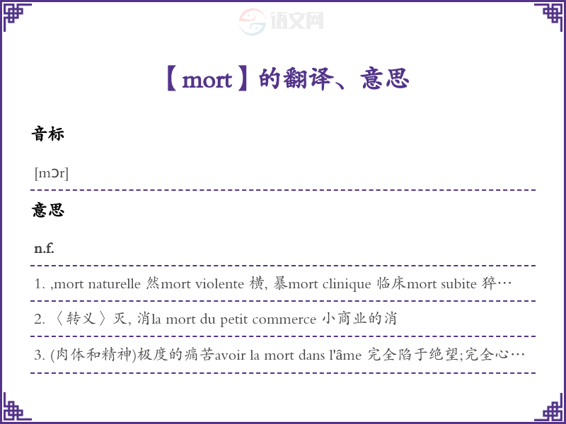 1. ,mort naturelle 然mort violente 横, 暴mort clinique 临床mort subite 猝condamner qn à (la peine de) mort 判处某人刑arrêt de mort 刑判决donner la mort 杀être à (deux doigts de) la mort , être à l'article de la mort , être sur son lit de mort 快要了, 奄奄一息, 垂危être entre la vie et la mort 处于生关头mourir de sa belle mort 善终, 寿终trouver la mort dans un accident 在事故中去échapper à la mort 幸免一apprendre la mort de qn par la rubrique nécrologique 从讣告中得知某人的讯la petite mort 性高潮C'est une question de vie ou de mort. 这是生攸关的问题。un silence de mort 一般的寂静pulsion de mort 【心理学】愿望, 冲动accident sans mort d'homme〈书面语〉无事故Ce n'est pas la mort. 这不了人。 [指情况不是很严重。事情不很困难]À mort! 杀他!打他!À mort le tyran! 处暴君!