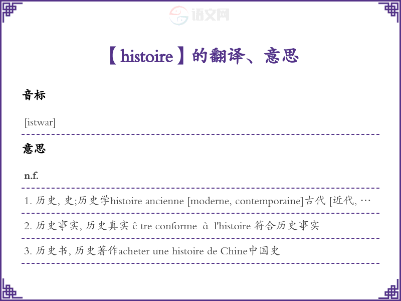 1. 历史, 史;历史学histoire ancienne [moderne, contemporaine]古代 [近代, 现当代] 史histoire générale通史histoire de la philosophie [de la littérature]哲学 [文学] 史histoire des mentalités心态史la petite histoire 稗史histoire du globe球史histoire naturelle博物学peinture d'histoire 历史画professeur d'histoire 历史教师étudier [apprendre] l'histoire du monde研究 [学习] 世界史les documents de l'histoire 历史资料