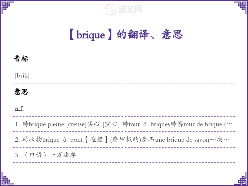 【brique】 词源: 派生: 近义词 同音、近音词 联想词